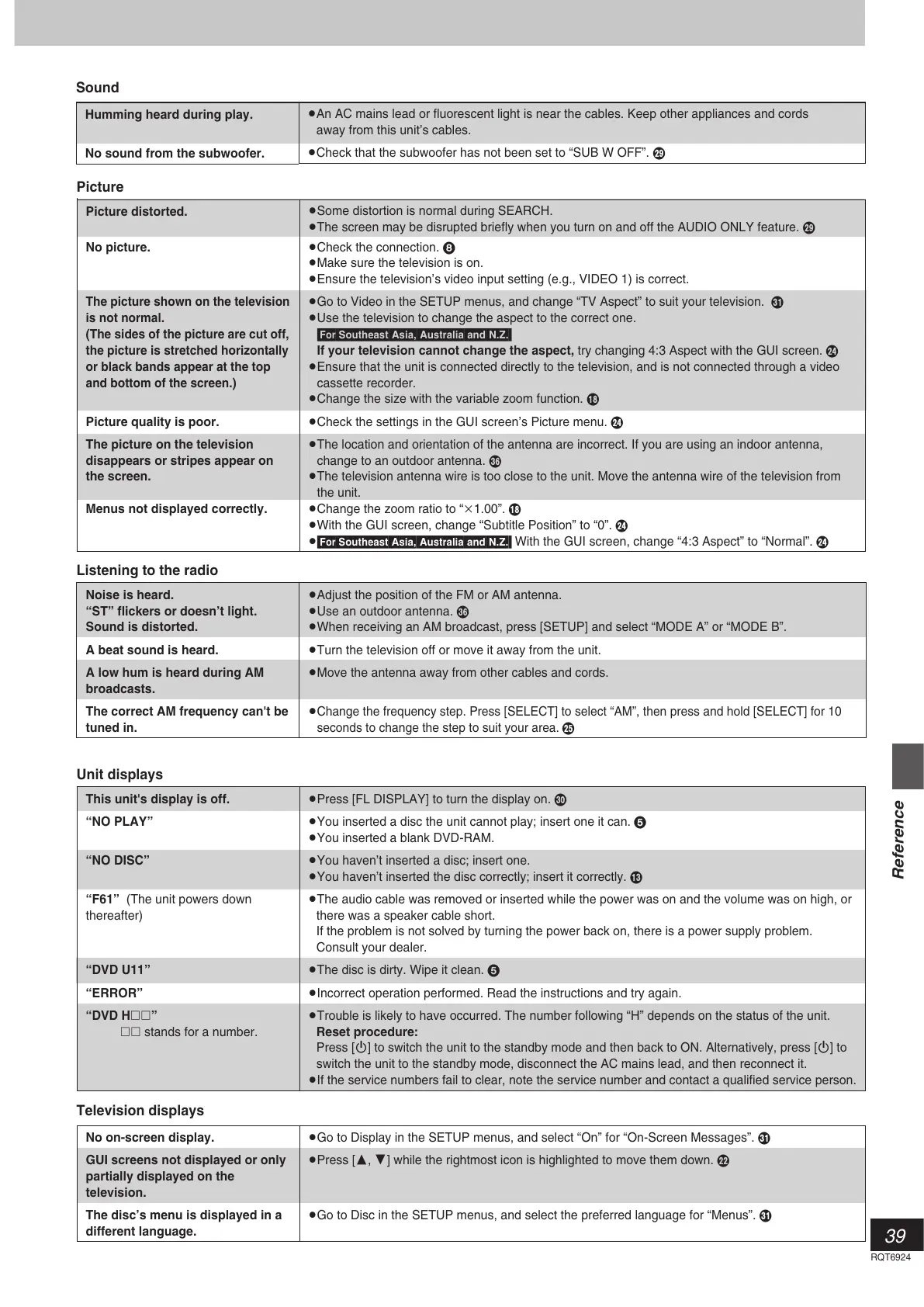 Panasonic SL-DT310 - Reference: Troubleshooting Guide (Continued); Troubleshooting Picture and Sound Problems