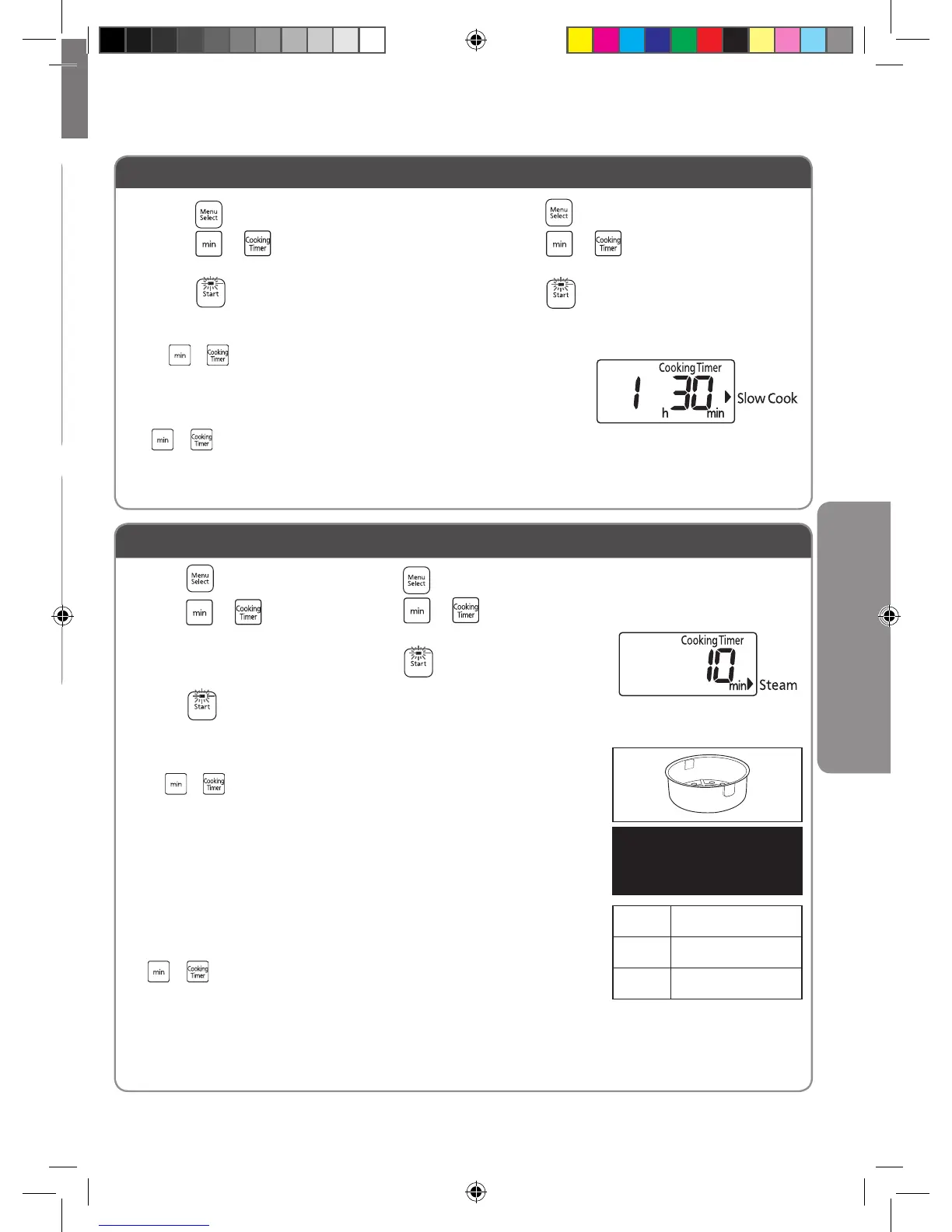 如右表所示,往內鍋加水。因此,水不會蒸干,即使選擇最大蒸時間 (60 分鐘)。