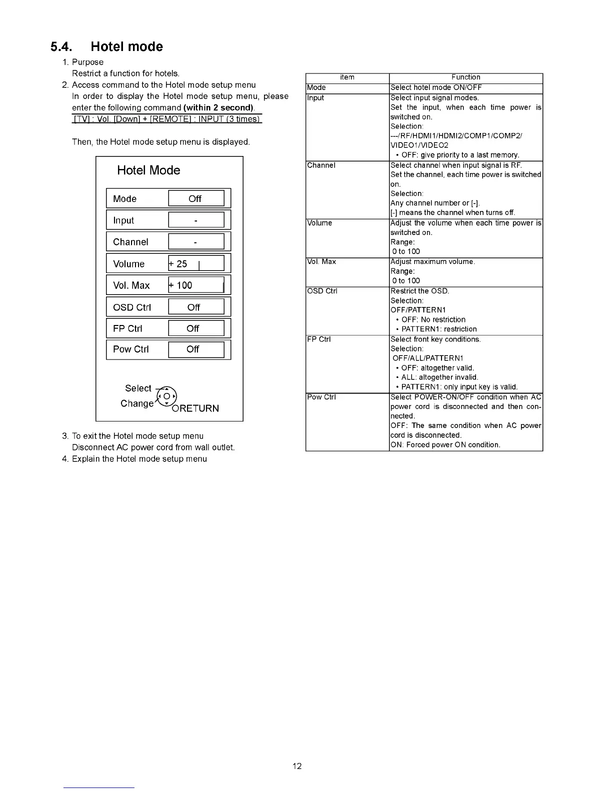 Mode Select hotel mode ON/OFF