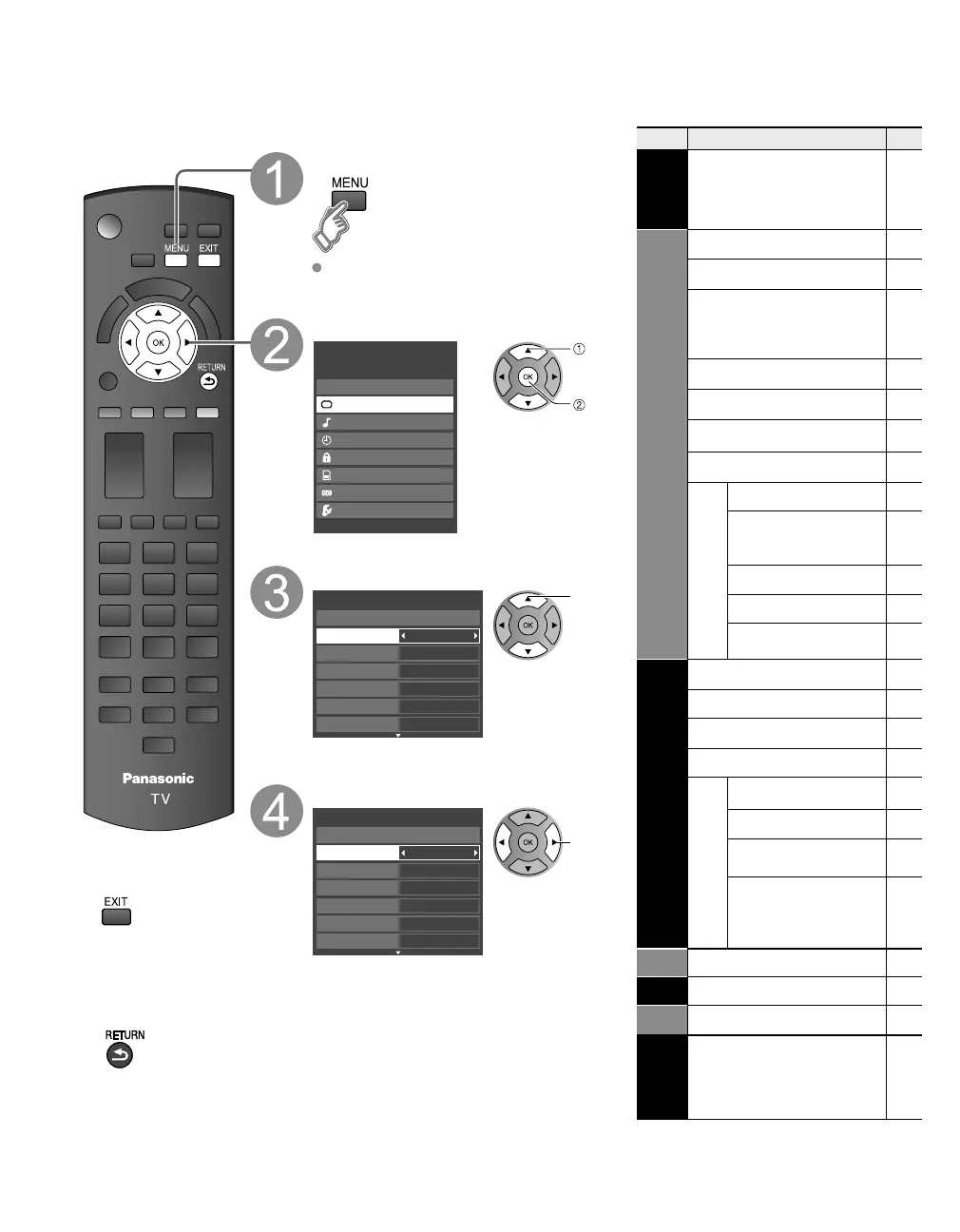 Menu listVarious menus allow you to make settings for the picture, sound, and