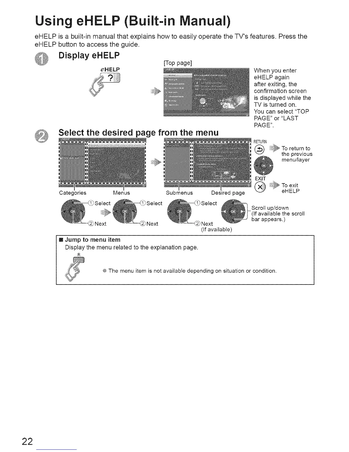 eHELP is a built-in manual that explains how to easily operate the TV's features. Press the