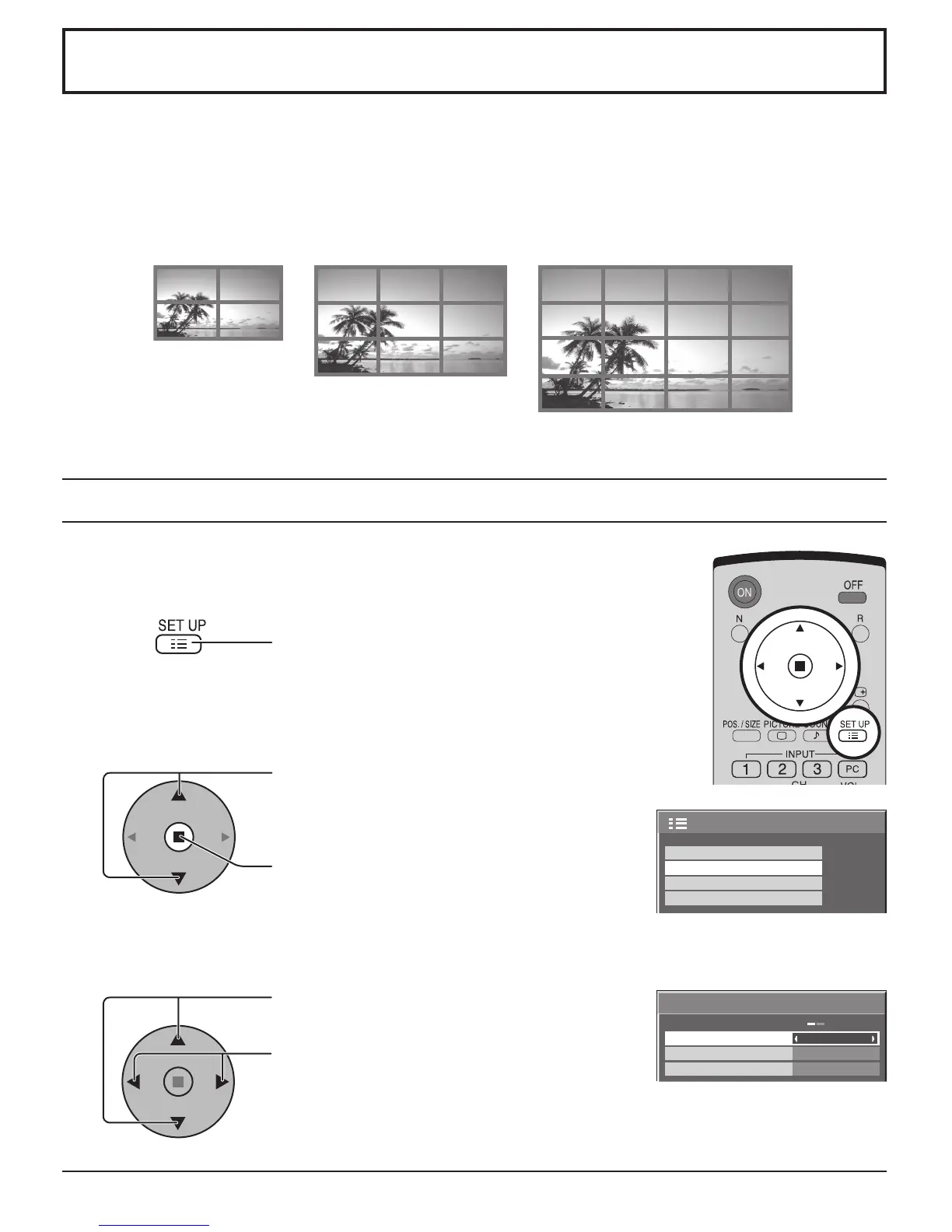 By lining up Plasma Displays in groups of 4, 9 or 16 as illustrated below, an enlarged picture may be displayed across all