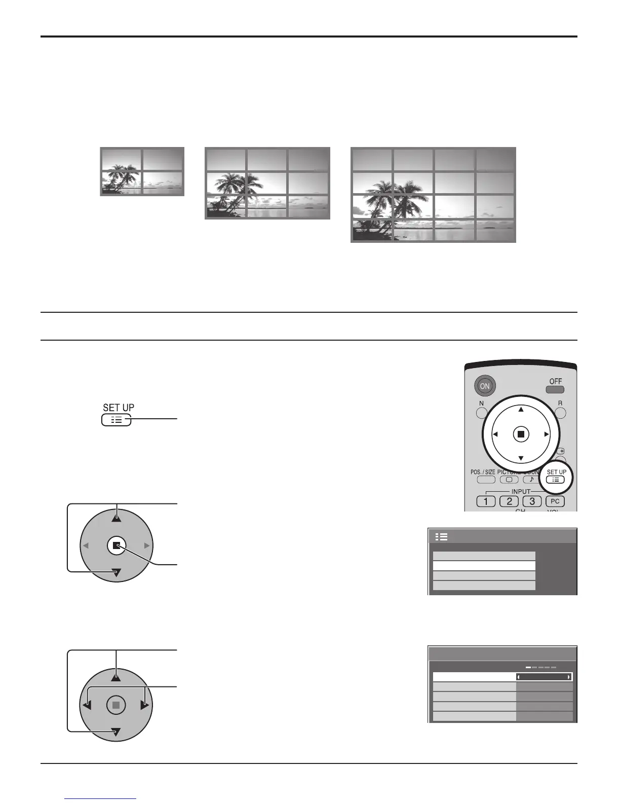 By lining up Plasma Displays in groups of 4, 9 or 16 as illustrated below, an enlarged picture may be displayed across all