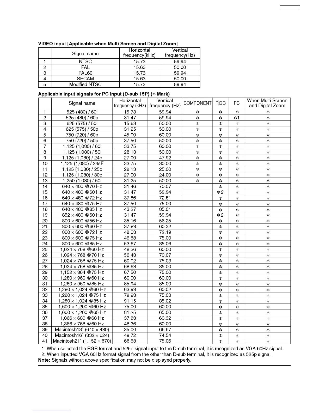 Panasonic TH-37PW7BX - 1 Applicable Signals