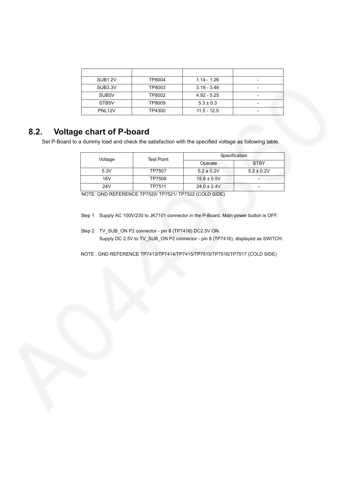 Step 2 TV_SUB_ON P2 connector - pin 8 (TP7416) DC2.5V ON.