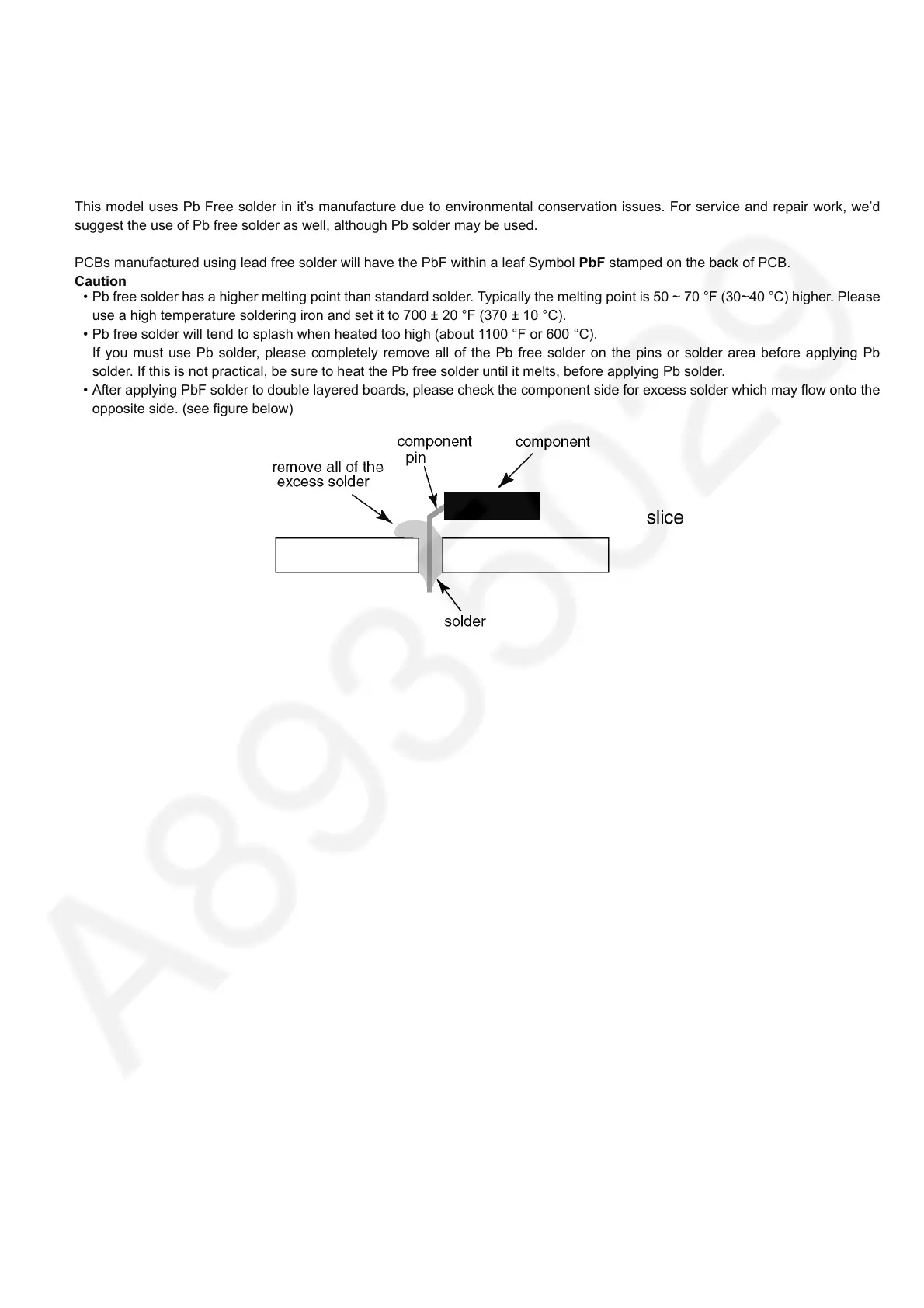 • After applying PbF solder to double layered boards, please check the component side for excess solder which may flow onto the