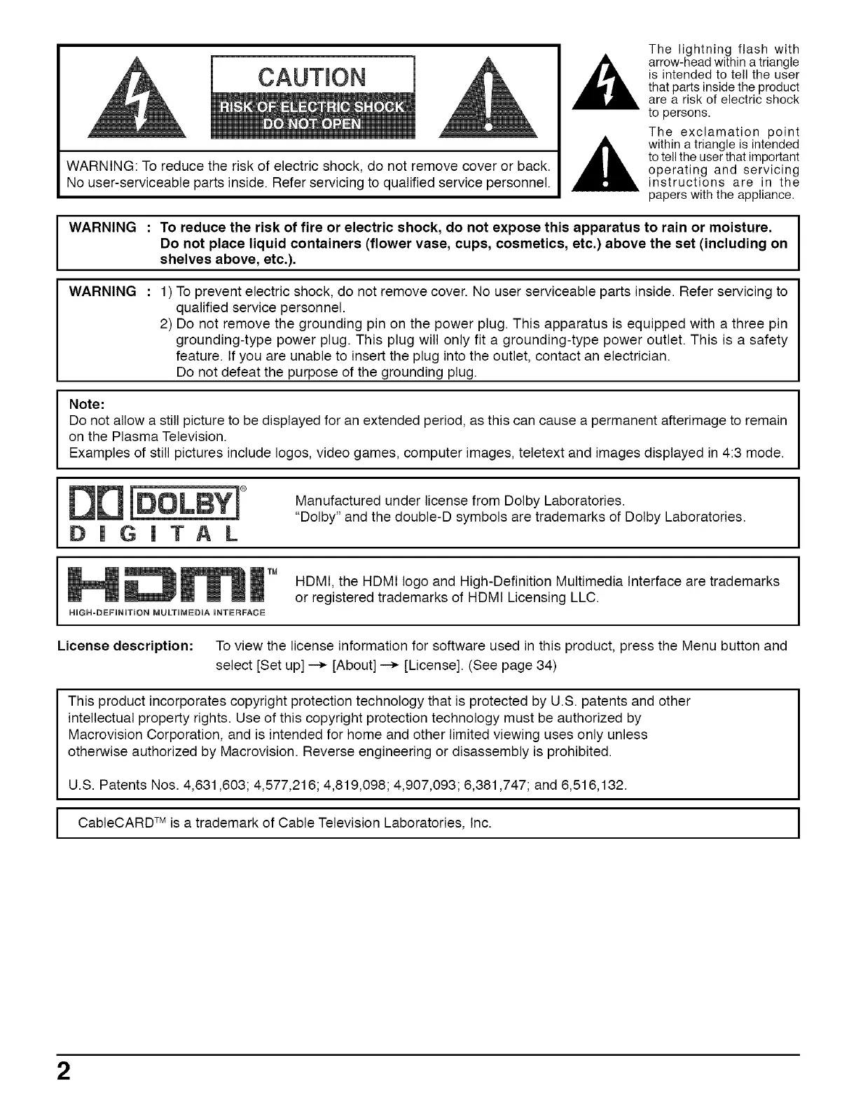 WARNING: To reduce the risk of electric shock, do not remove cover or back.