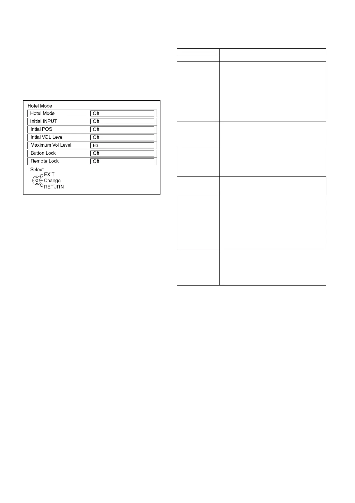 Hotel Mode Select hotel mode ON/OFF