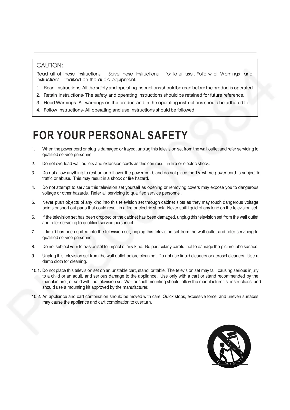 10.1. Do not place this television set on an unstable cart, stand, or table. The television set may fall, causing serious injury