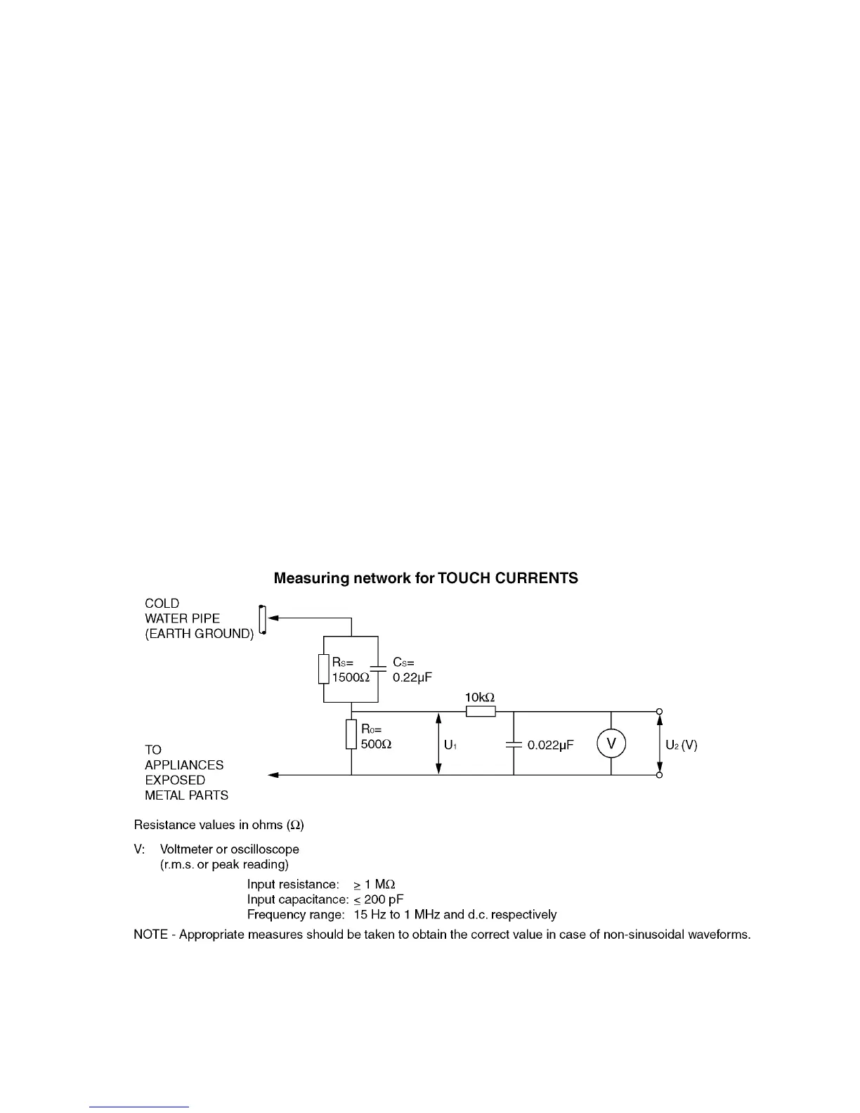 2. Connect a measuring network for touch currents between each exposed metallic part on the set and a good earth ground