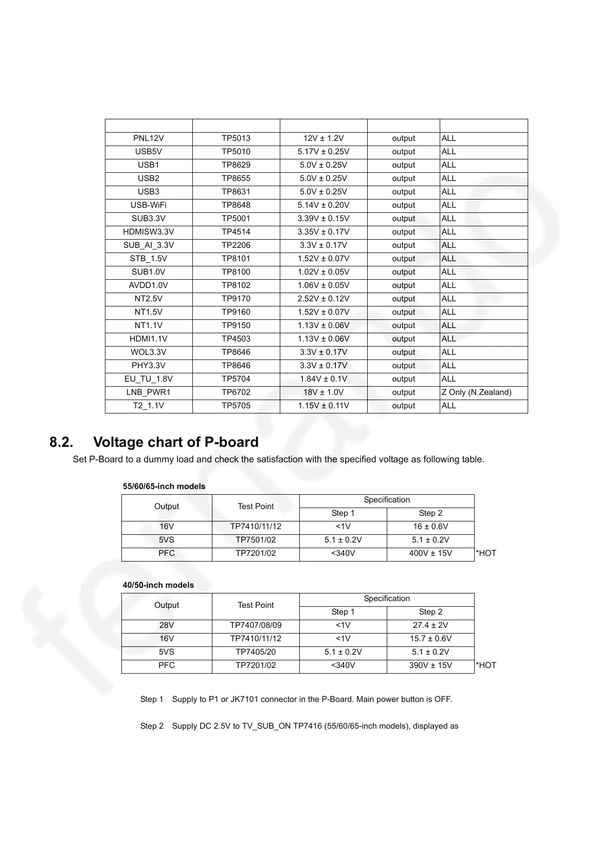 Set P-Board to a dummy load and check the satisfaction with the specified voltage as following table.