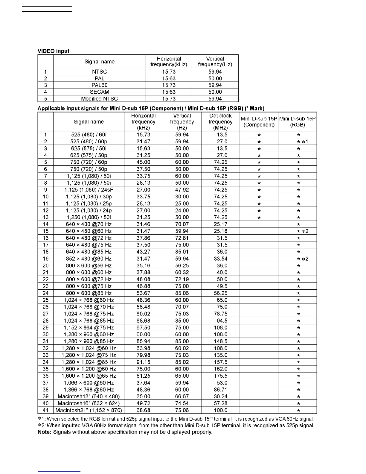 Panasonic TH-58PH10BK - Applicable Signals