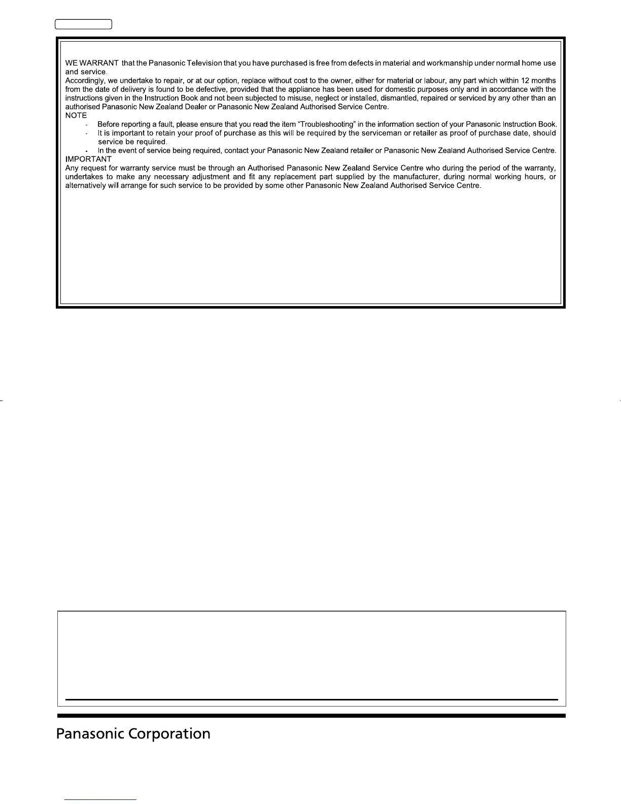 Distributed in New Zealand by Panasonic New Zealand Limited