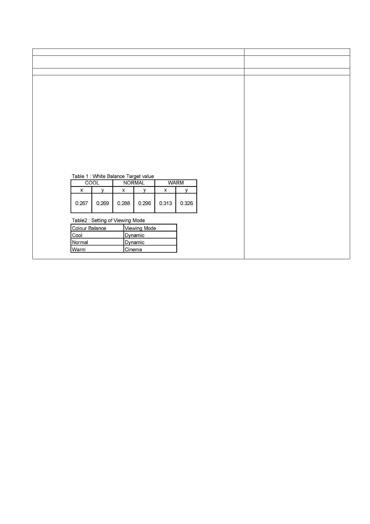 4. Check that the colour balance and the viewing mode is the values written in table1 and 2.