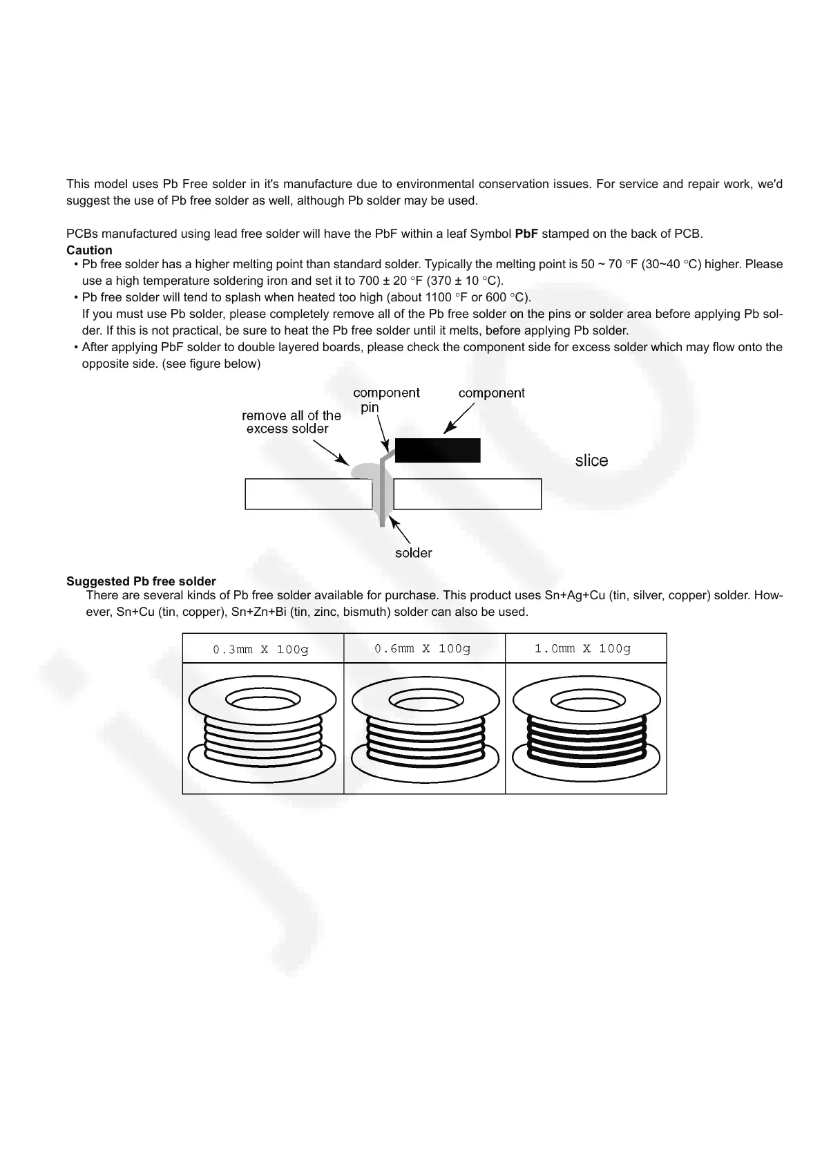 • After applying PbF solder to double layered boards, please check the component side for excess solder which may flow onto the