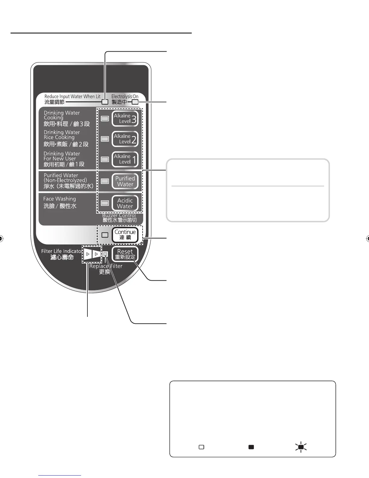 亮起時表示本機正在製造鹼性離子水或酸性水。