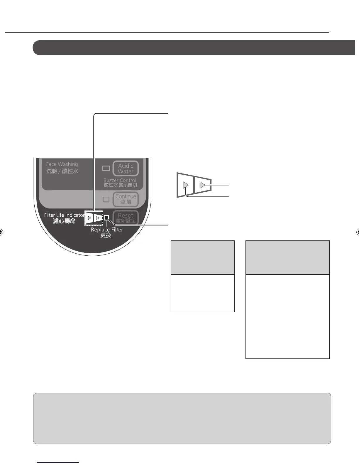 本產品可根據總通水量或流量的降低,及濾心壽命顯示燈和濾心更換顯示燈的信號,而查知是否需要更換