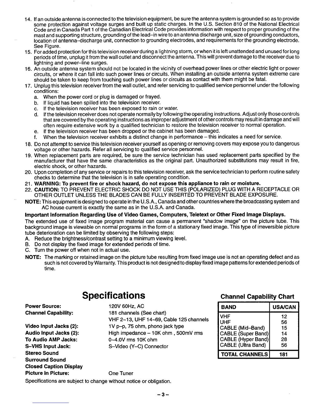 The extended use of fixed image program material can cause a permanent "shadow image" on the picture tube. This
