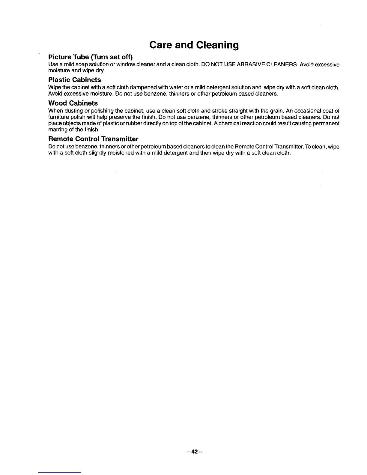 Do not use benzene, thinners or other petroleum based cleaners to clean the Remote Control Transmitter. To clean, wipe