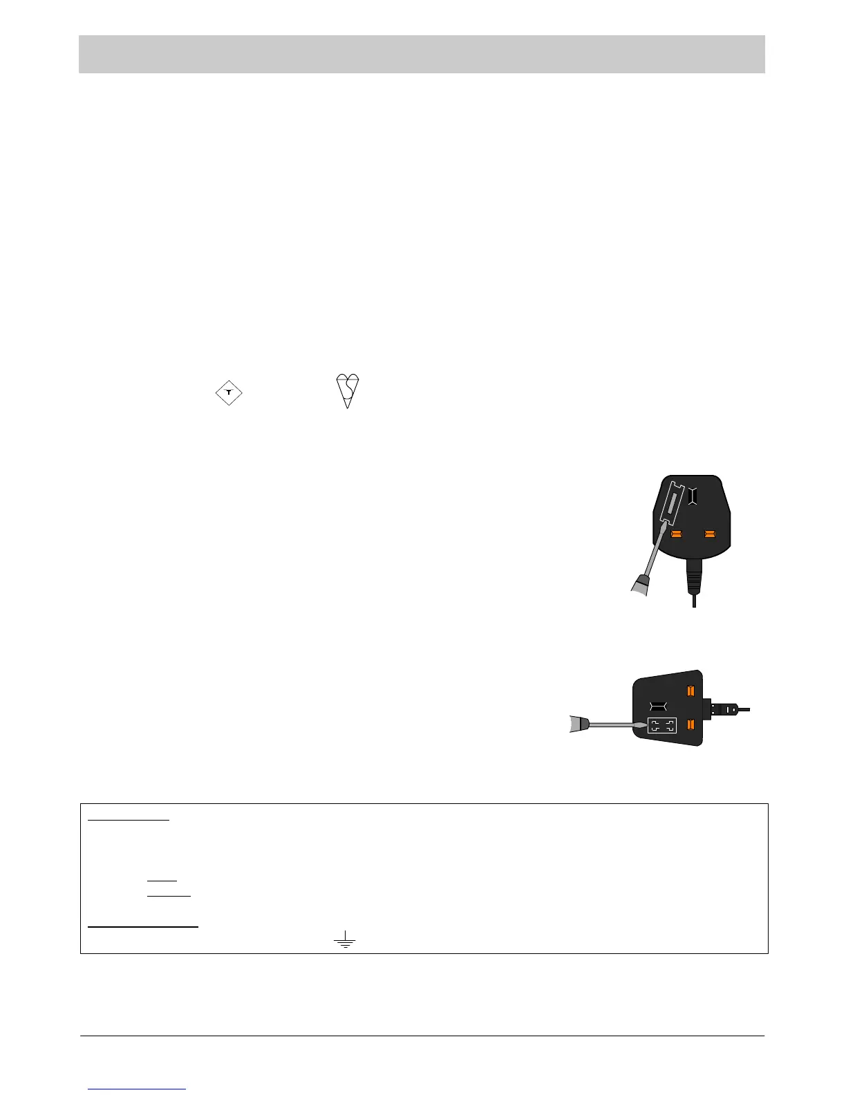 : Under no circumstances should either of these wires be connected to the Earth terminal of the three pin plug,