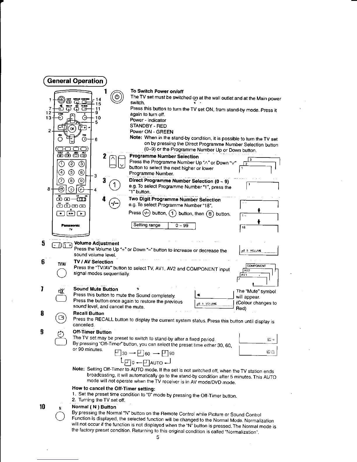 Panasonic TX-21FJ50M - General TV Operation; Basic Controls: Power, Volume, Channel, Input; Advanced Features: Muting, Timers, Normalization