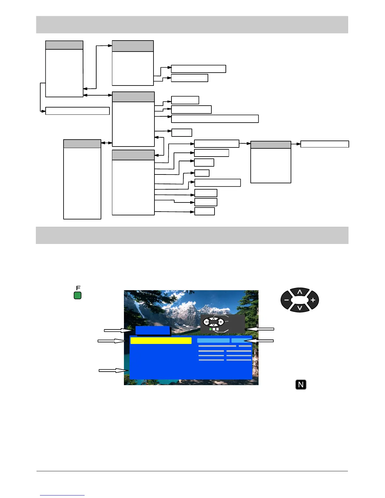 By pressing button “F” you either enter the on---screen indications menu or go back to another menu.