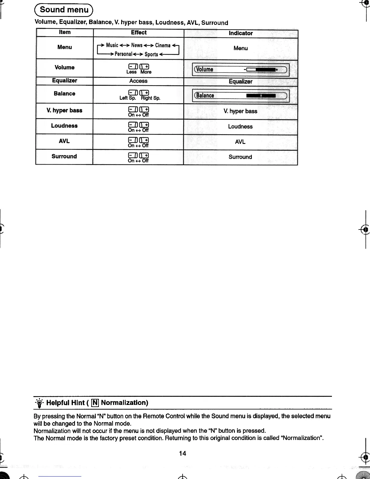 By pressing the Normal "N" button on the Remote Control while the Sound menu is displayed, the selected menu