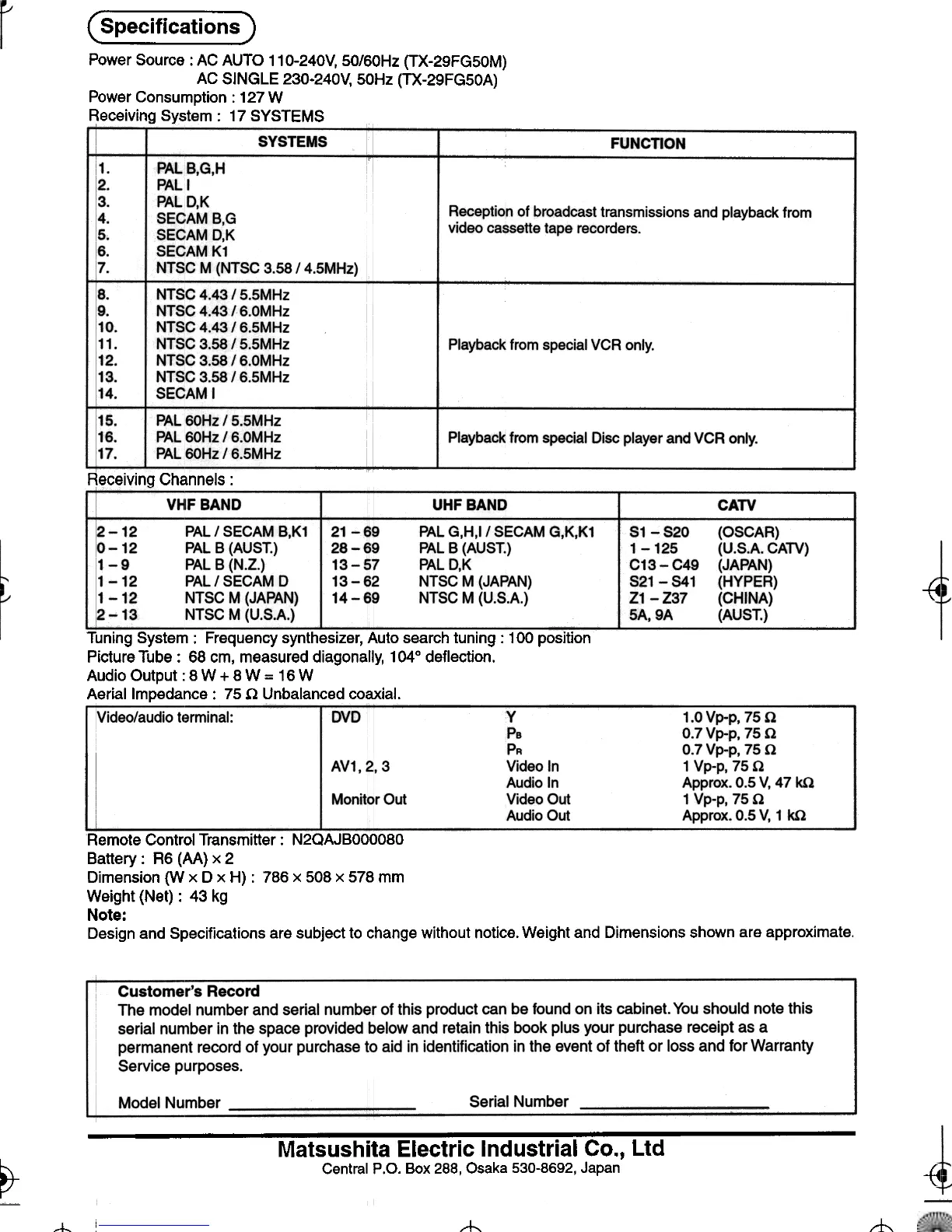 Power Source: AC AUTO 11 0-240V, 50/60Hz (TX-29FG50M)