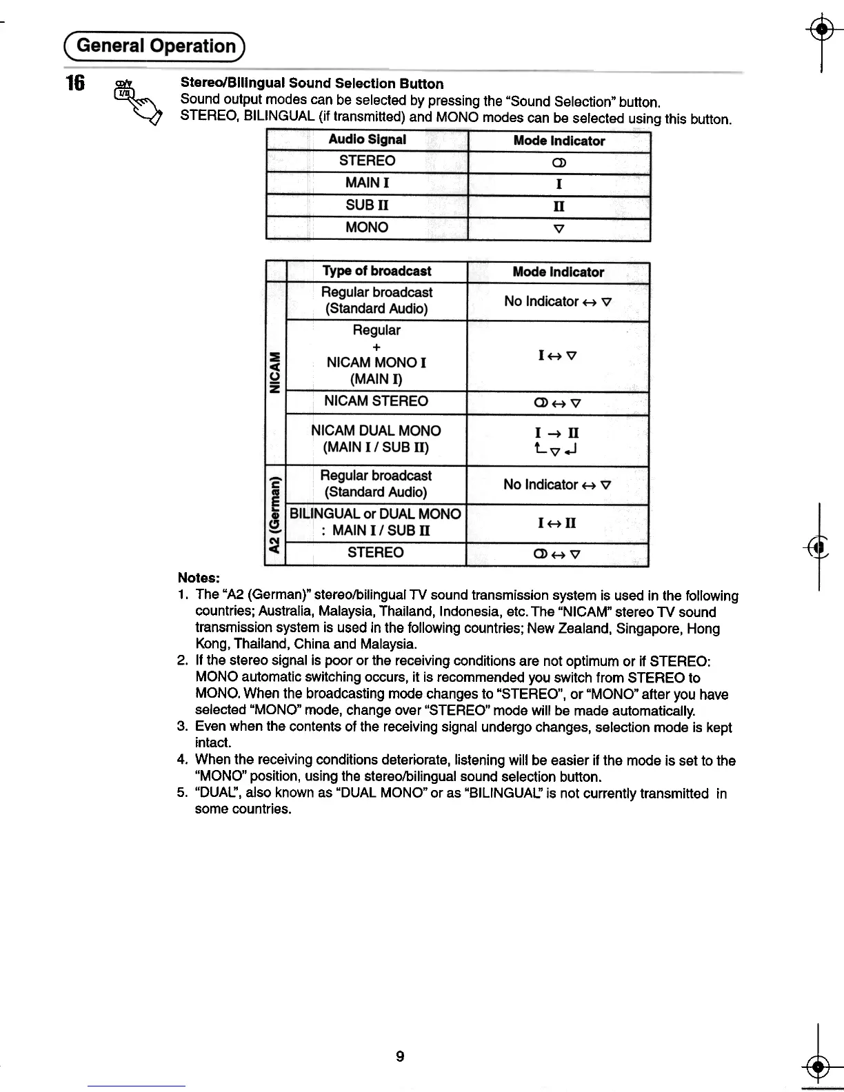 ~ Stereo/Bilingual Sound Selection Button "" Sound output modes can be selected by pressing the "Sound Selection" button.