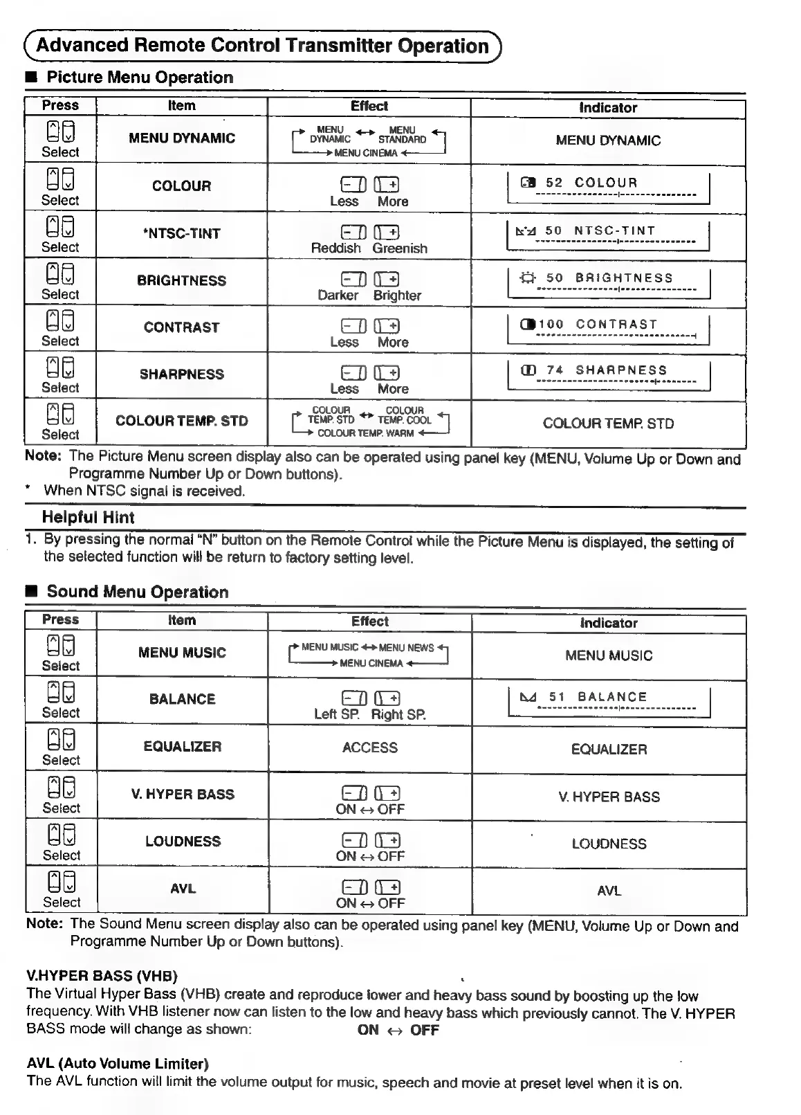 Panasonic TX-29FJ50A - Remote Control Operations; Remote Picture Menu Operation; Remote Sound Menu Operation