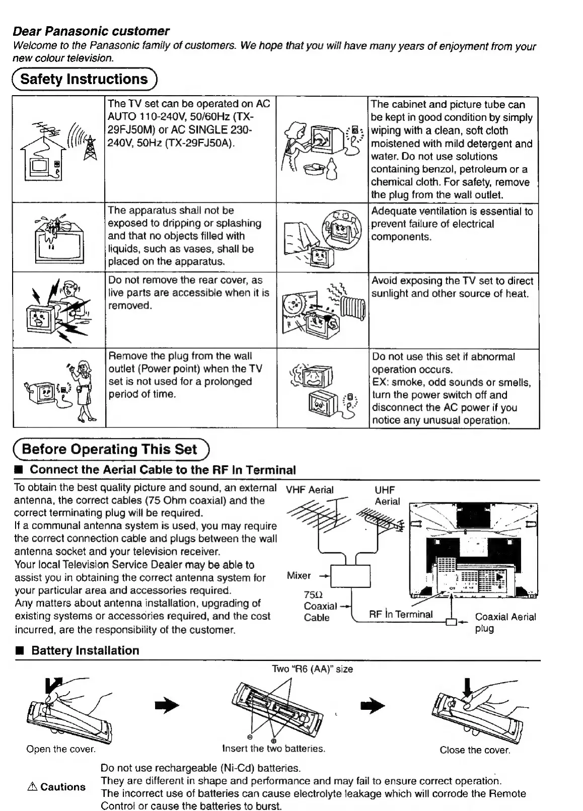 Panasonic TX-29FJ50A - Safety Instructions; General Safety Instructions; Connect Aerial Cable to RF In Terminal