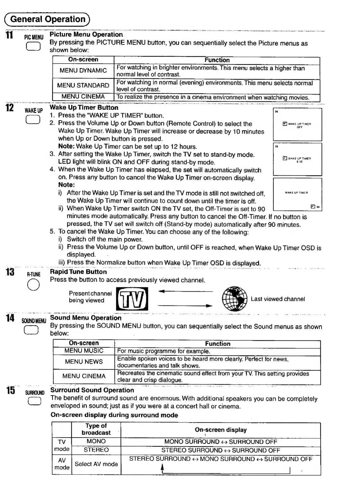 Panasonic TX-29FJ50A - Advanced General Operations; Picture Menu Operation; Sound Menu Operation