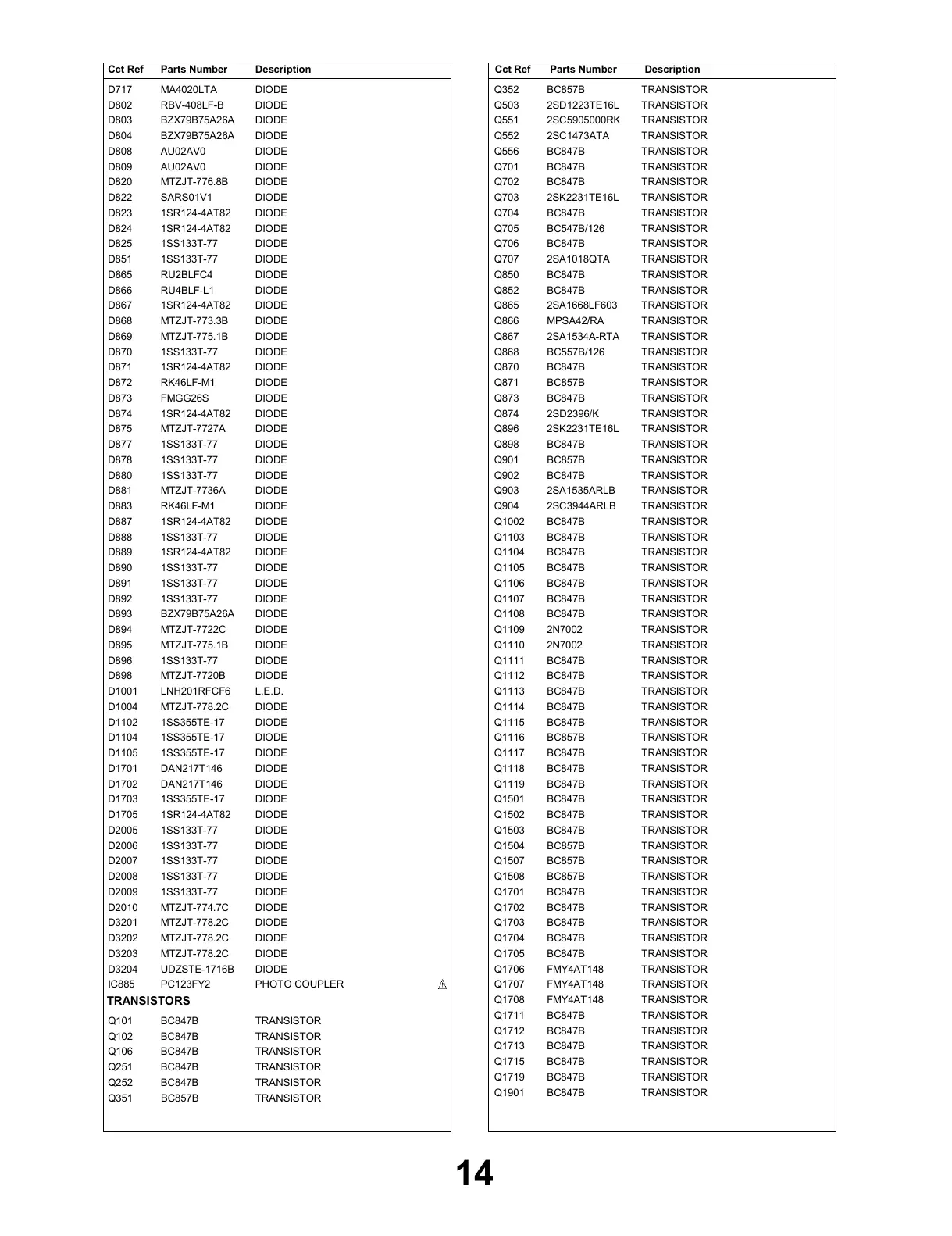 DescriptionCct Ref Parts Number DescriptionCct Ref Parts Number