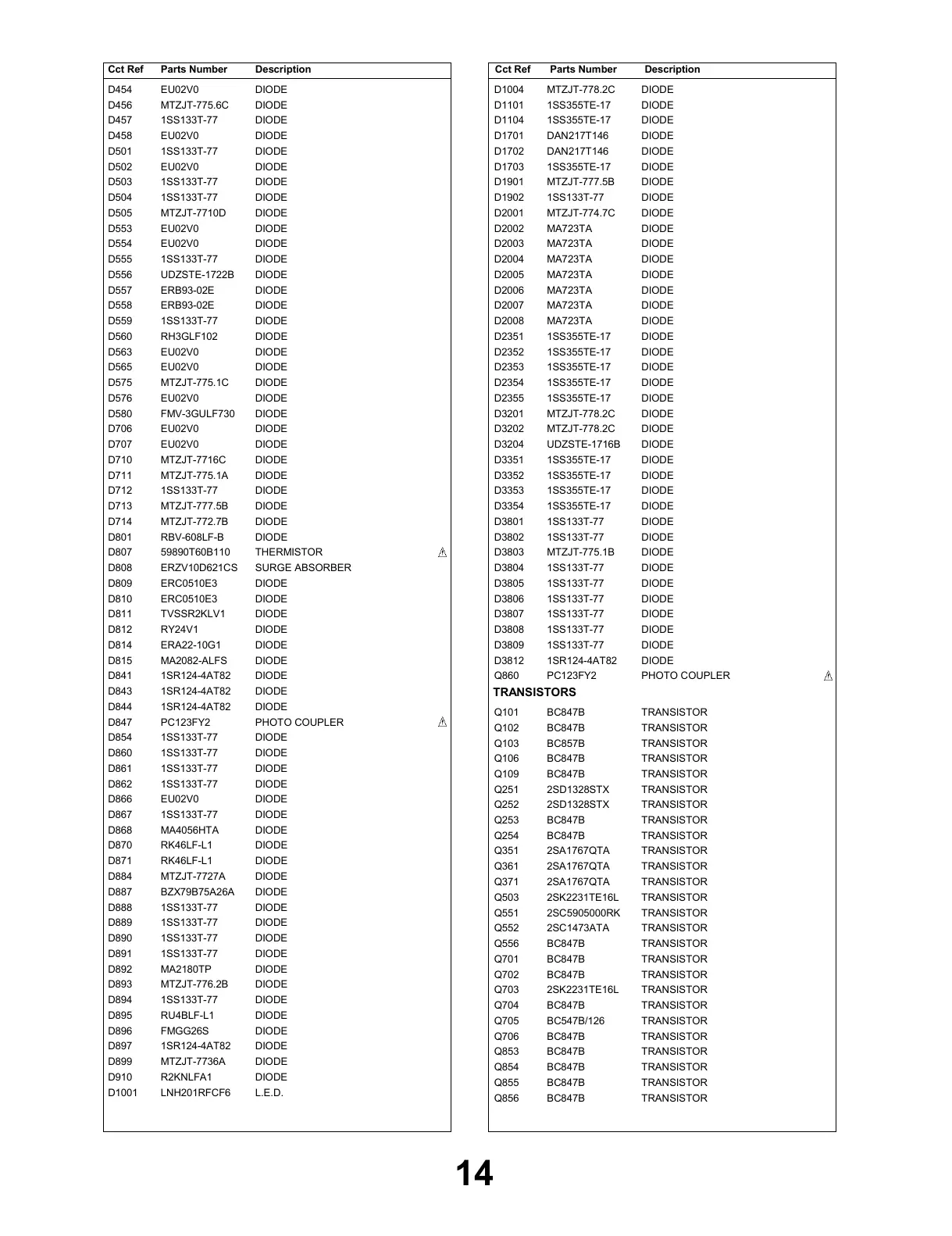 DescriptionCct Ref Parts Number DescriptionCct Ref Parts Number