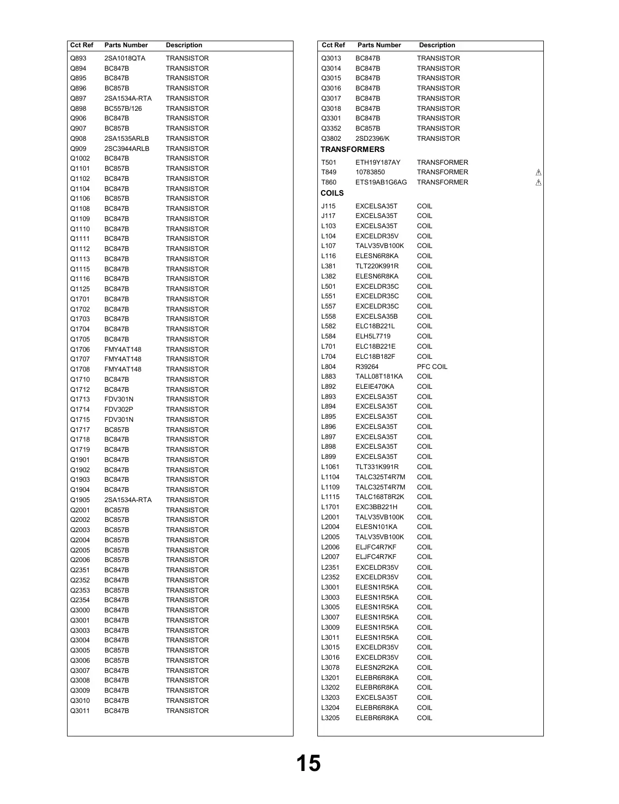 DescriptionCct Ref Parts Number DescriptionCct Ref Parts Number