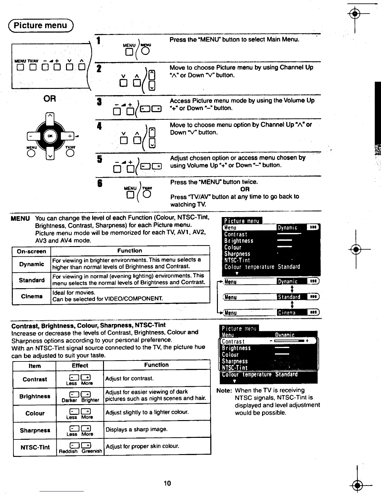 Contrast, Brightness, Colour, Sharpness, NTSC- Tint