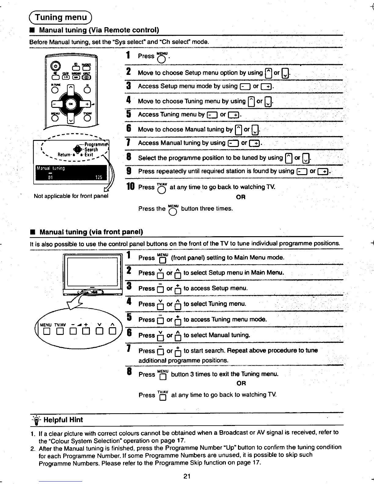 2. Alter the Manual tuning is finished, press the Programme Number .Up" bullon to confirm the tuning condition