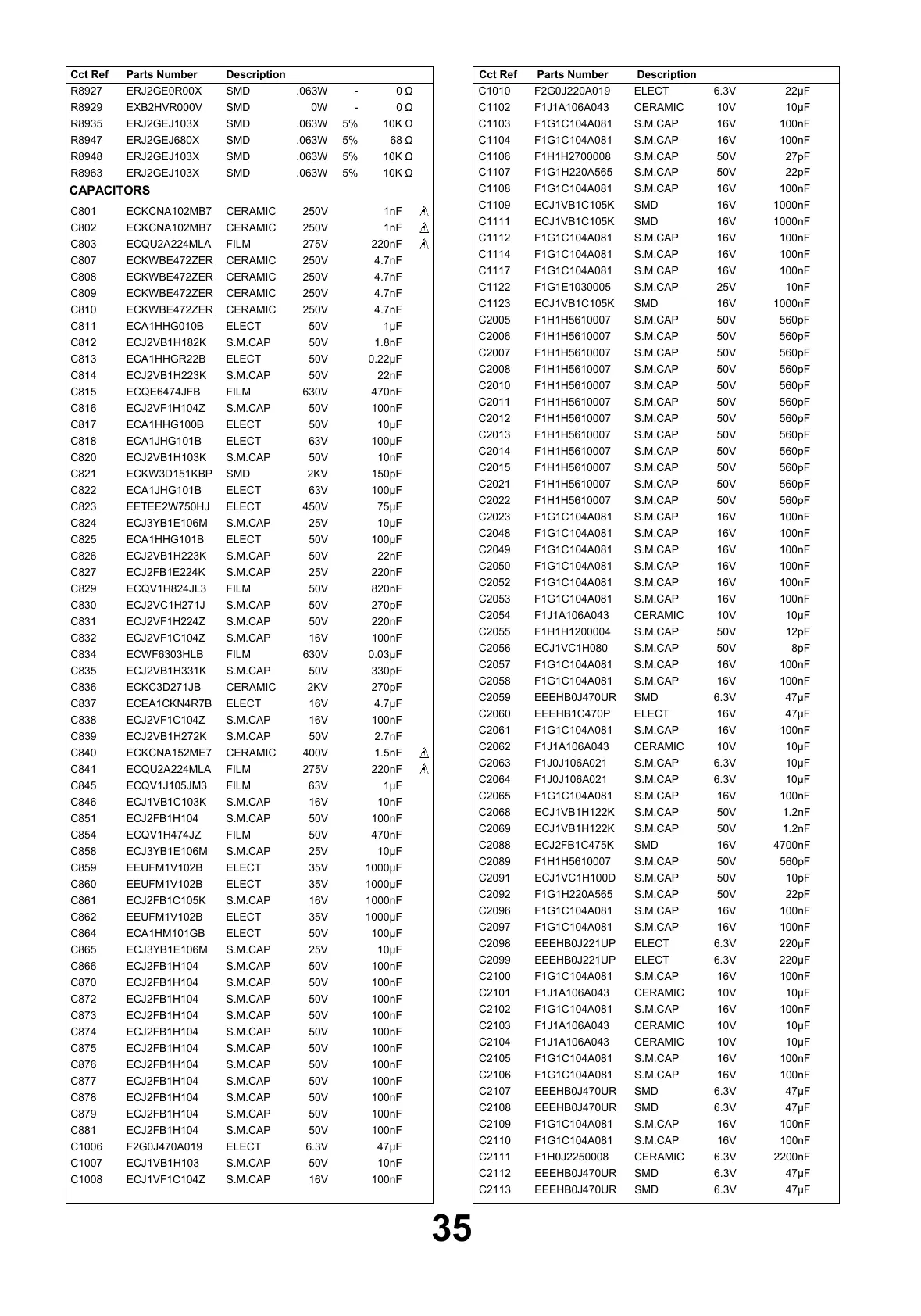 DescriptionCct Ref Parts Number DescriptionCct Ref Parts Number