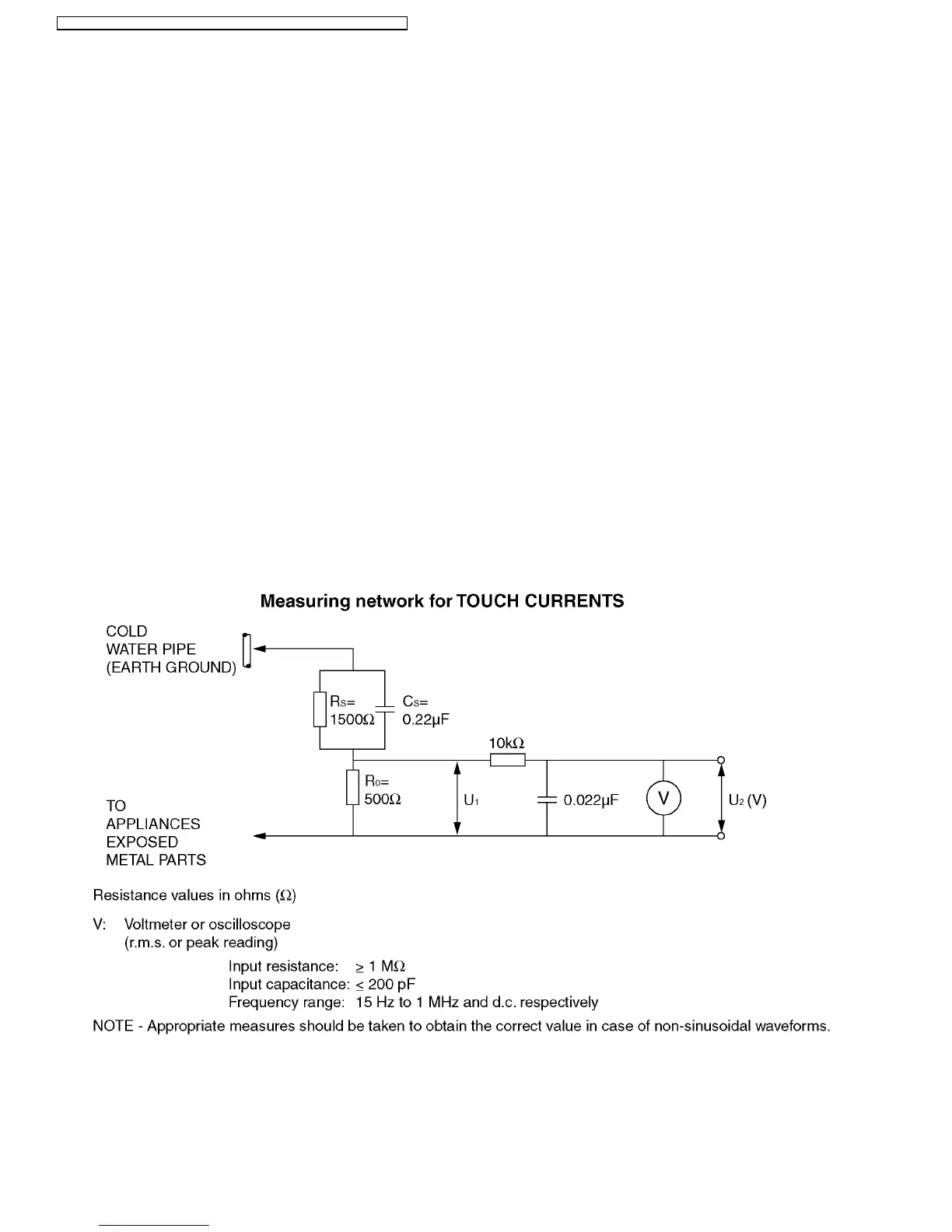 2. Connect a measuring network for touch currents between each exposed metallic part on the set and a good earth ground such