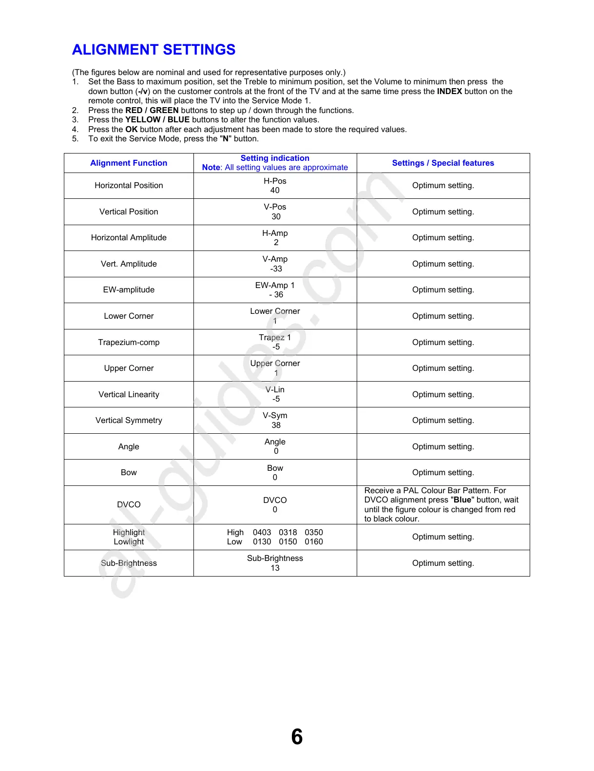 4. Press the OK button after each adjustment has been made to store the required values.