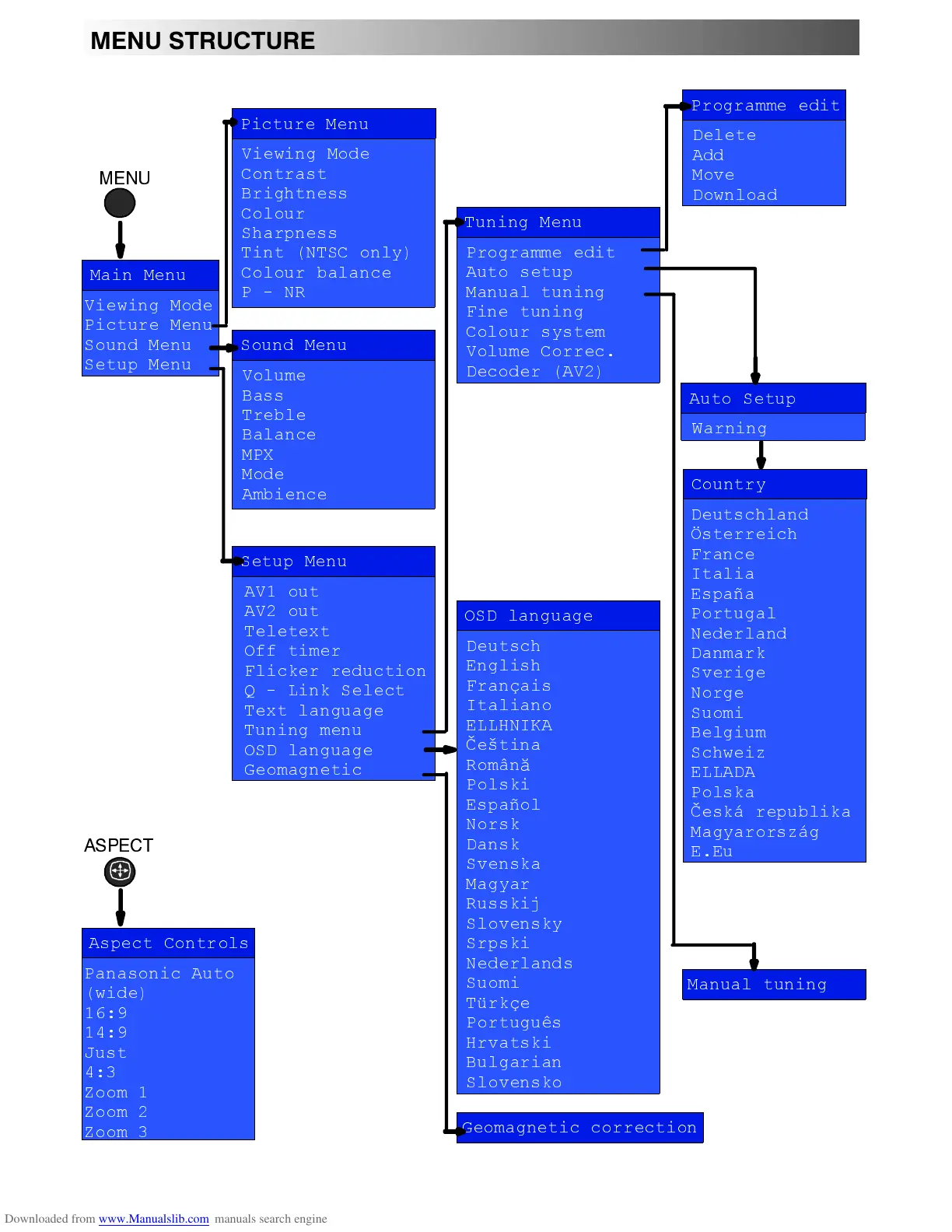 Panasonic TX-32PS11P - Menu Structure Overview; Main Menu Options; Menu Navigation; Aspect Controls Navigation