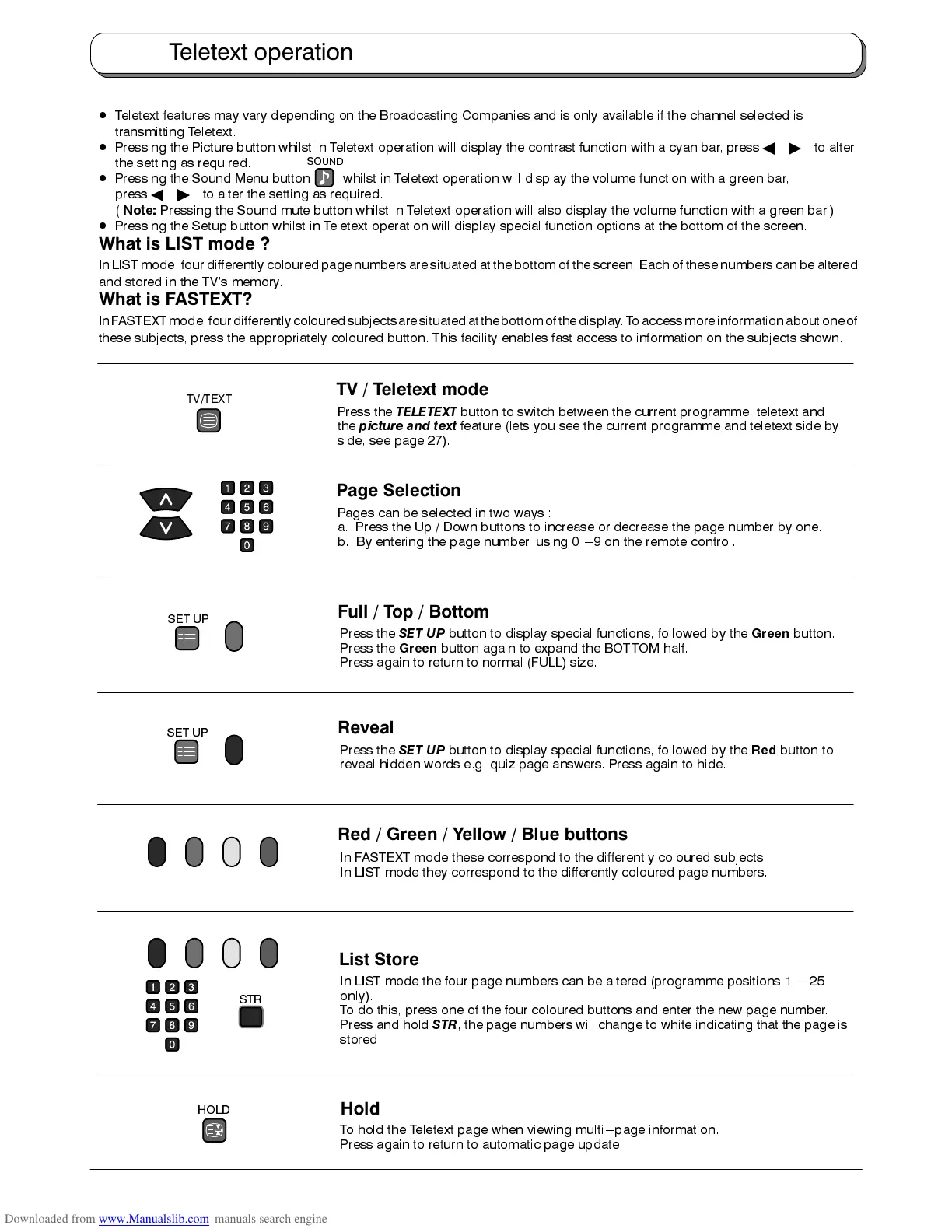 Pressing the Setup button whilst in Teletext operation will display special function options at the bottom of the screen.
