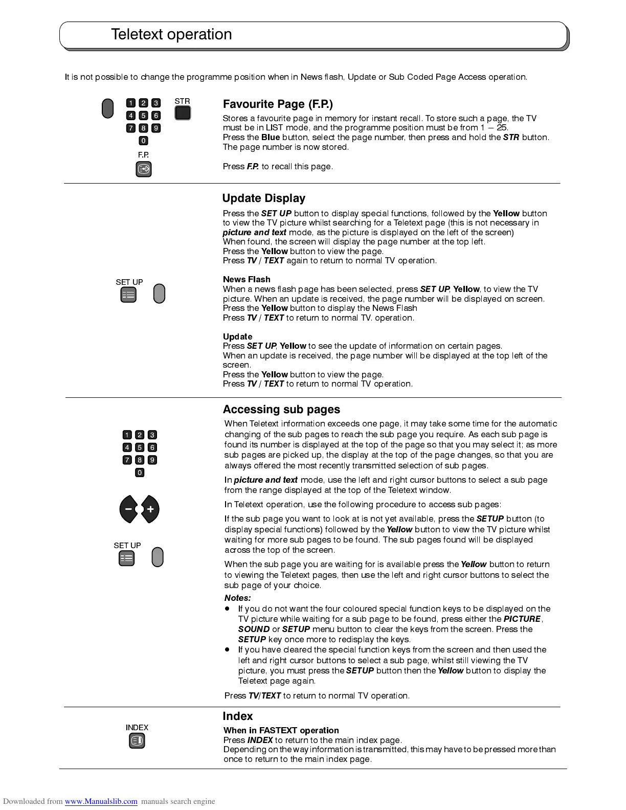 It is not possible to change the programme position when in News flash, Update or Sub Coded Page Access operation.