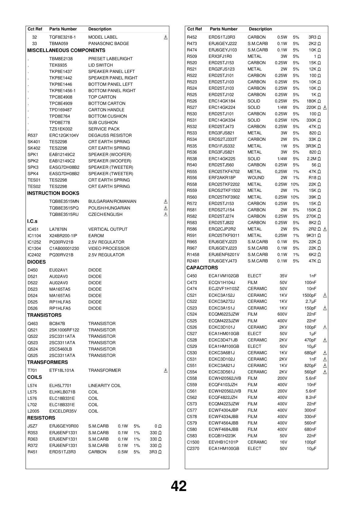 DescriptionCct Ref Parts Number DescriptionCct Ref Parts Number