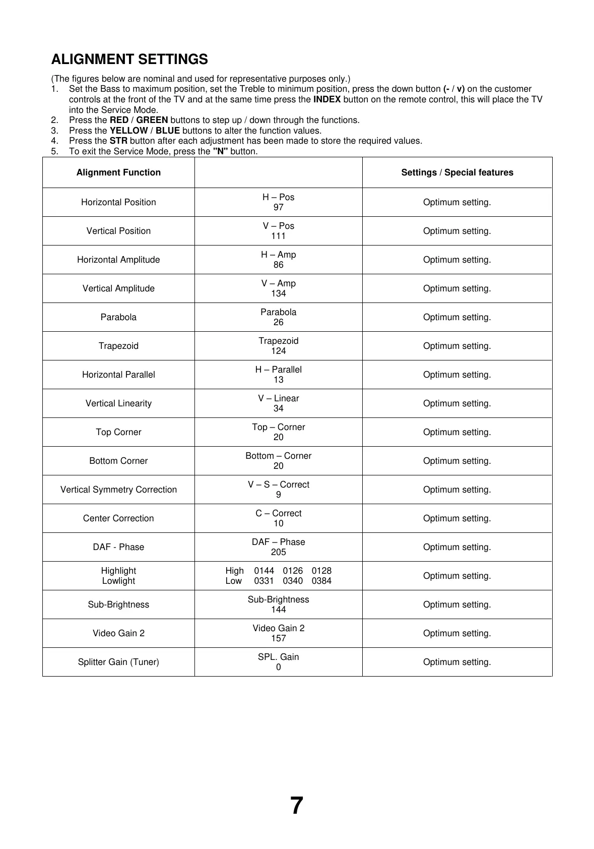 3. Press the YELLOW / BLUE buttons to alter the function values.