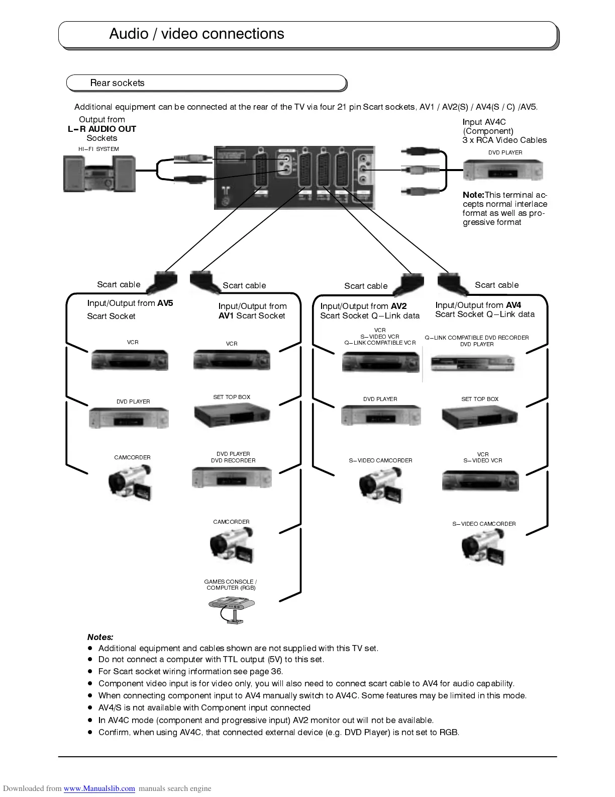 Additional equipment can be connected at the rear of the TV via four 21 pin Scart sockets, AV1 / AV2(S) / AV4(S / C) /AV5.