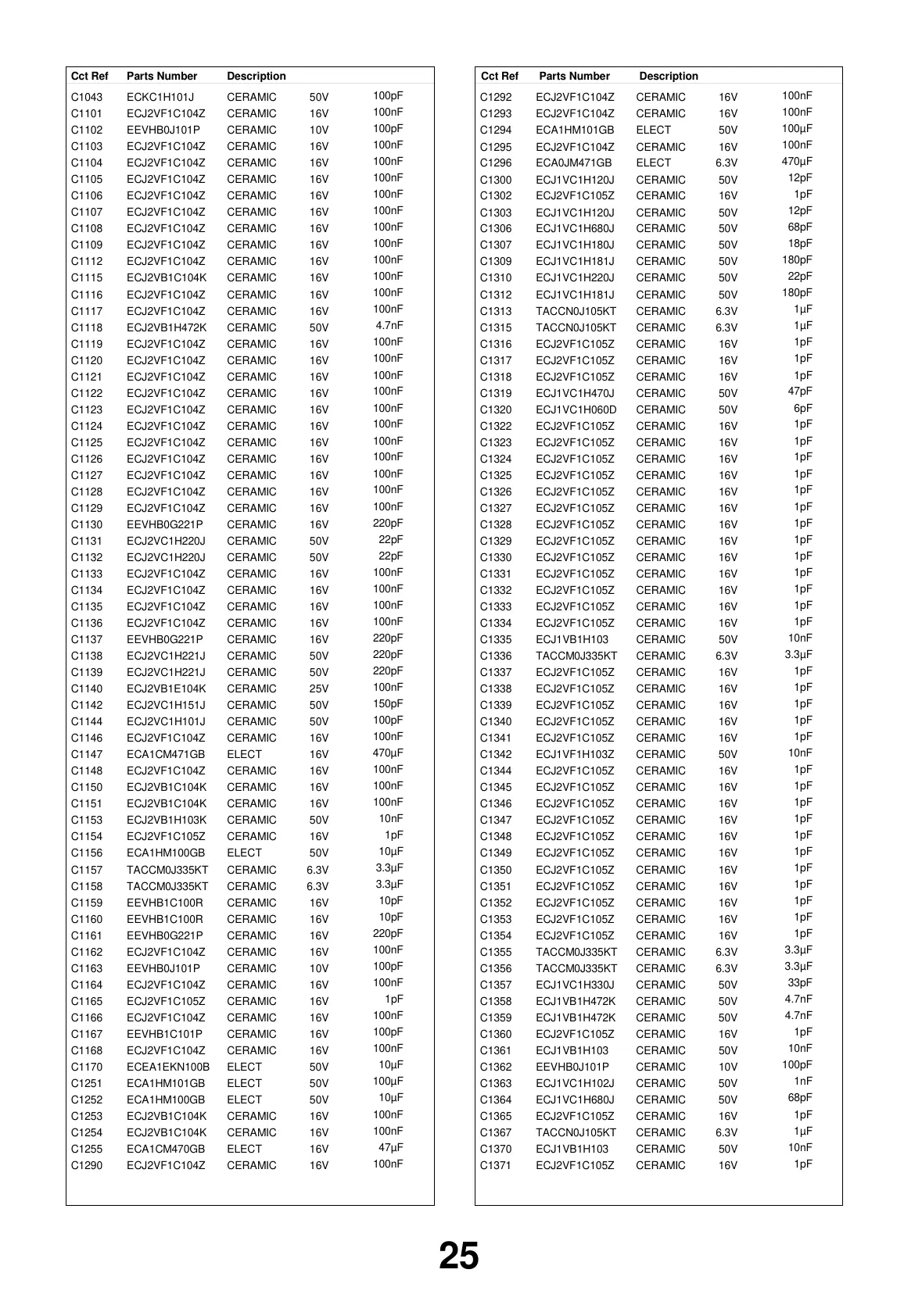 DescriptionCct Ref Parts Number DescriptionCct Ref Parts Number