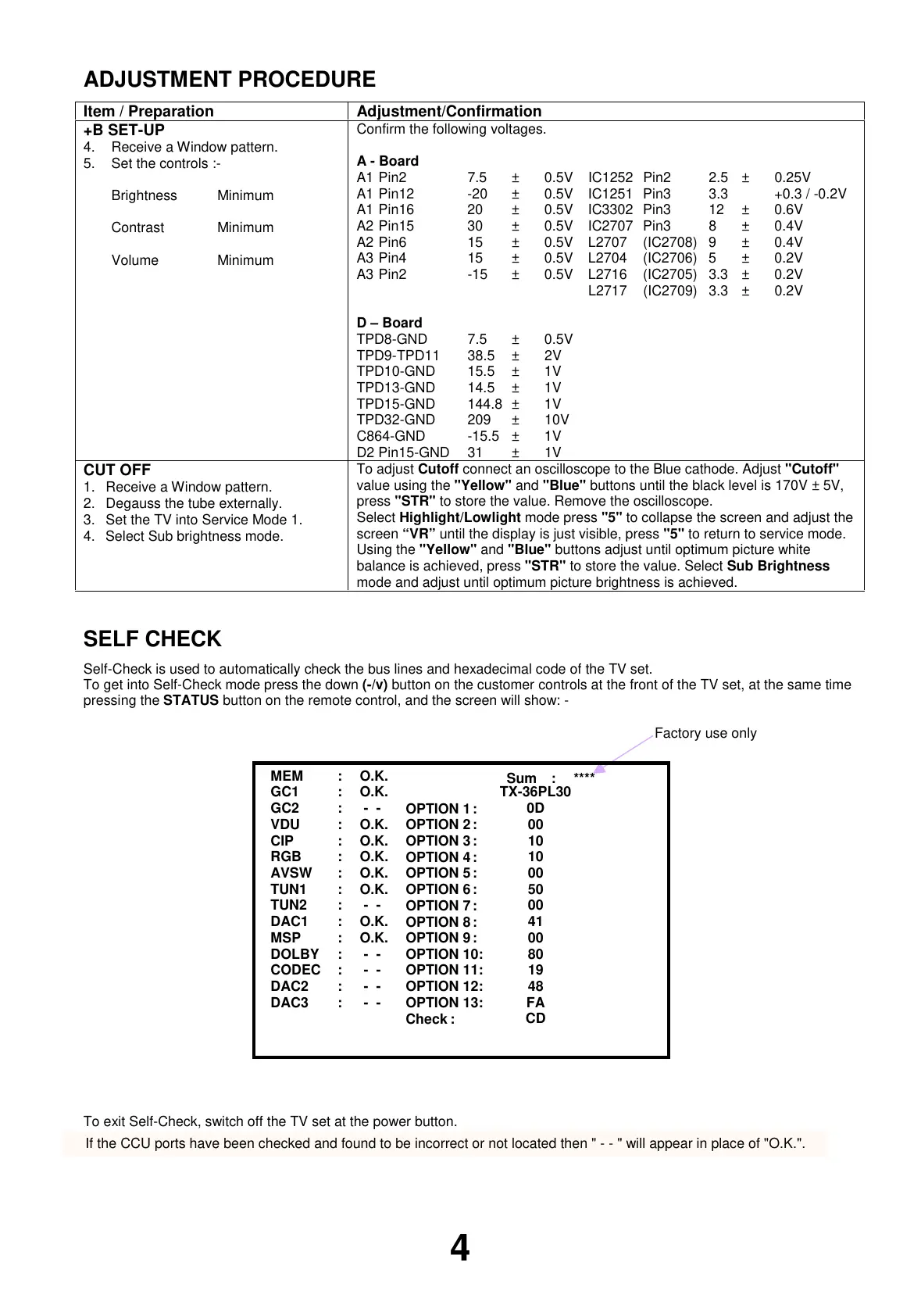 Self-Check is used to automatically check the bus lines and hexadecimal code of the TV set.
