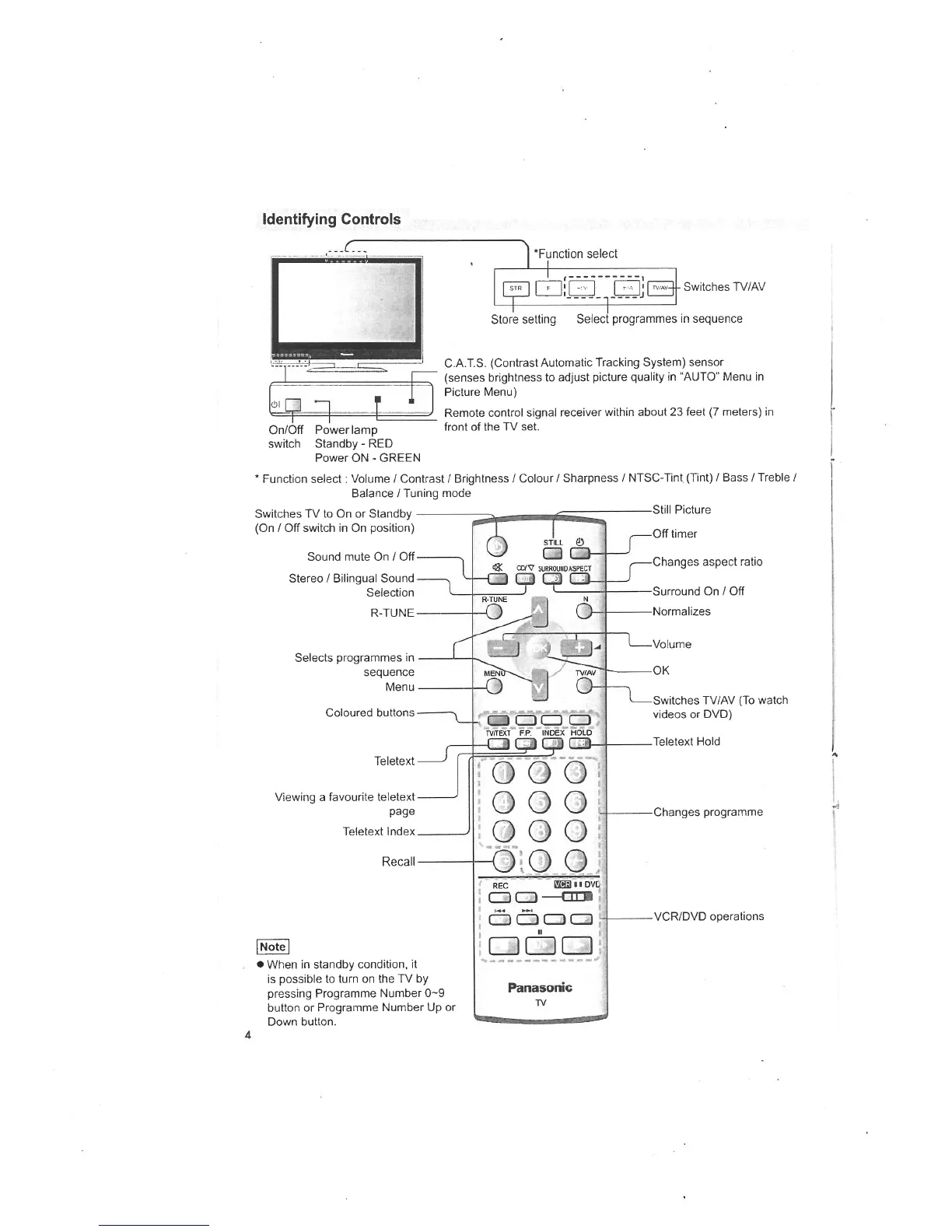 Panasonic TX-37LX75A - Identifying Controls; Remote Control Functions; TV Front Panel Features