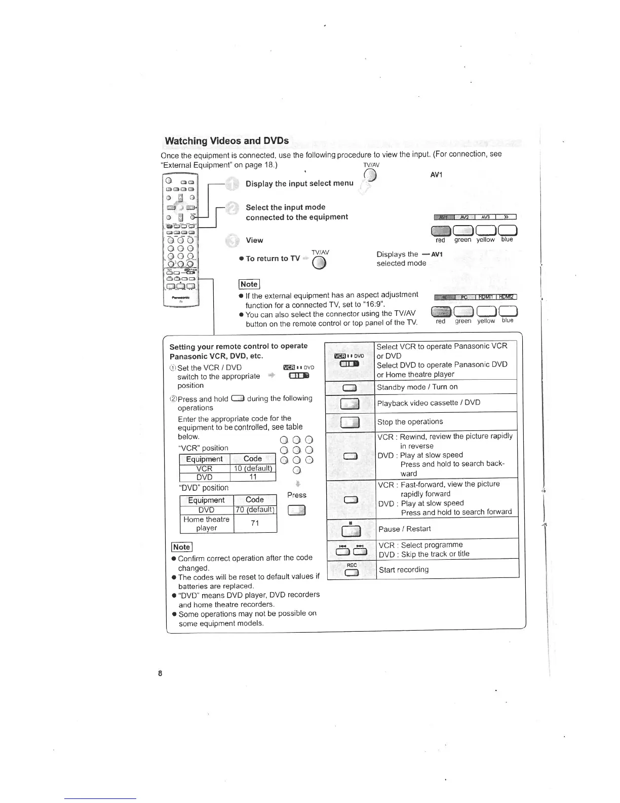 Panasonic TX-37LX75A - Watching Videos and DVDs; Selecting Input Sources; Remote Control Setup for VCR;DVD